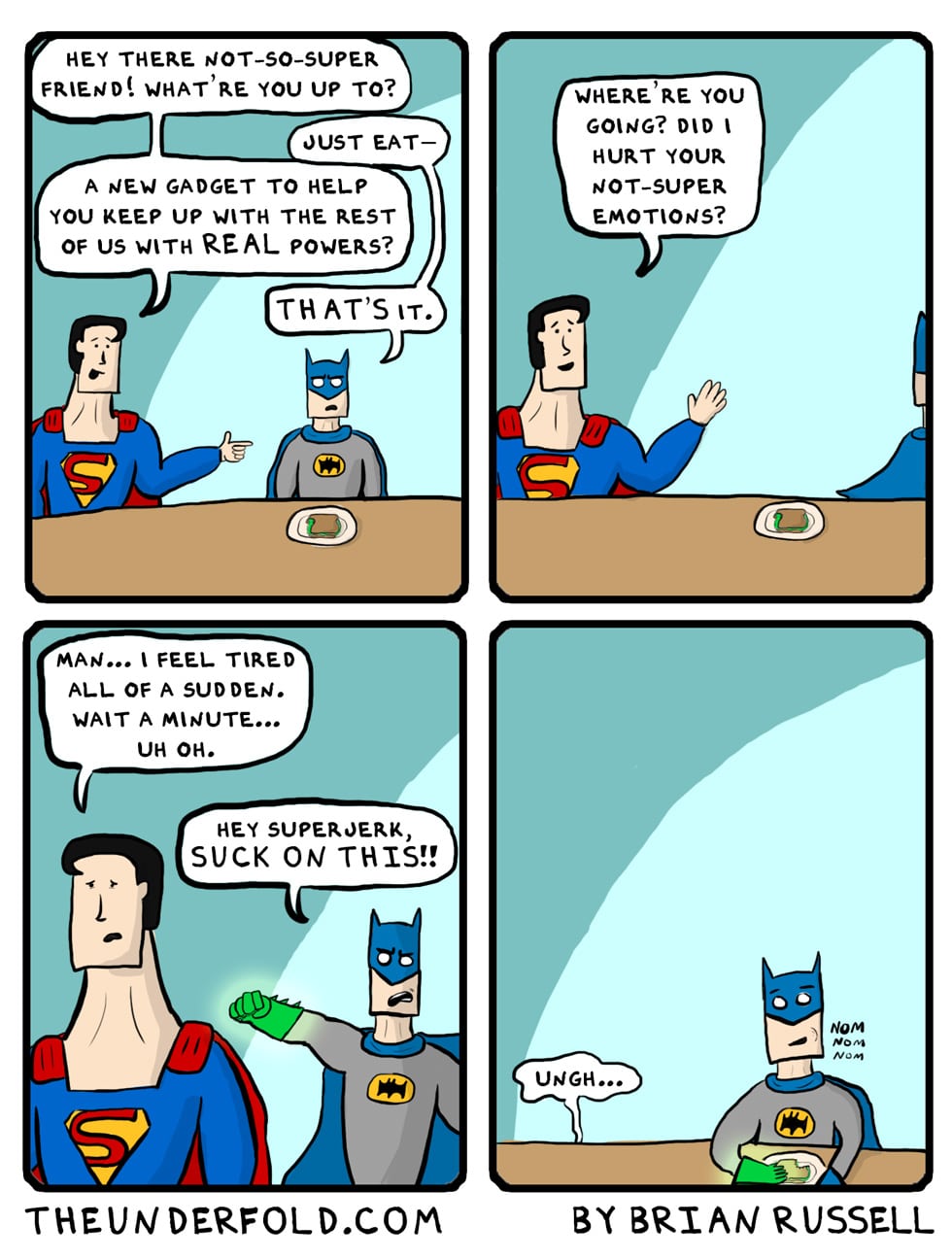 I notice his sammich has a green filling too. Perhaps Batman has a plan to keep jerk Superman away from him all the time.